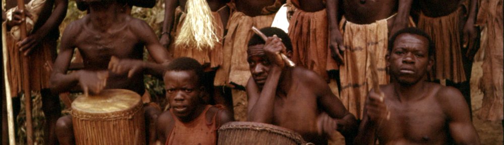 Photo above: Drummers and singers performing at a dance by masked circumcisers who are arriving in a village from where they will lead boys and young men to the circumcision lodge (Mukumo, 1957).
